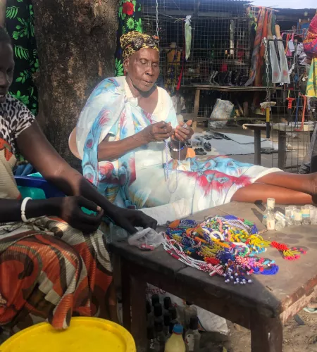 Elizabeth Gain Ngare (rechts) en Thonyan Nyerizen (links) zijn vrouwen uit de 'payam' Gogolthin in Pibor. Ze zijn beide weduwe en in het verleden ondersteund met noodhulp door ZOA. Nu maken ze armbandjes als vorm van levensonderhoud. Voor Thonya is het als weduwe en moeder van kleine kinderen zwaar om rond te komen. Door het maken en verkopen van deze armbandjes is ze in staat om haar kinderen te kunnen voeden.