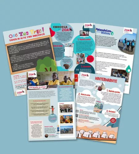 Alle acties zijn voorzien van een digitale gastles, lesbrieven, sponsorboekjes en posters en zijn zowel geschikt voor de onder- als bovenbouw. We komen ook heel graag bij jullie in de klas om over ZOA te vertellen. Voor welke actie kiezen jullie?