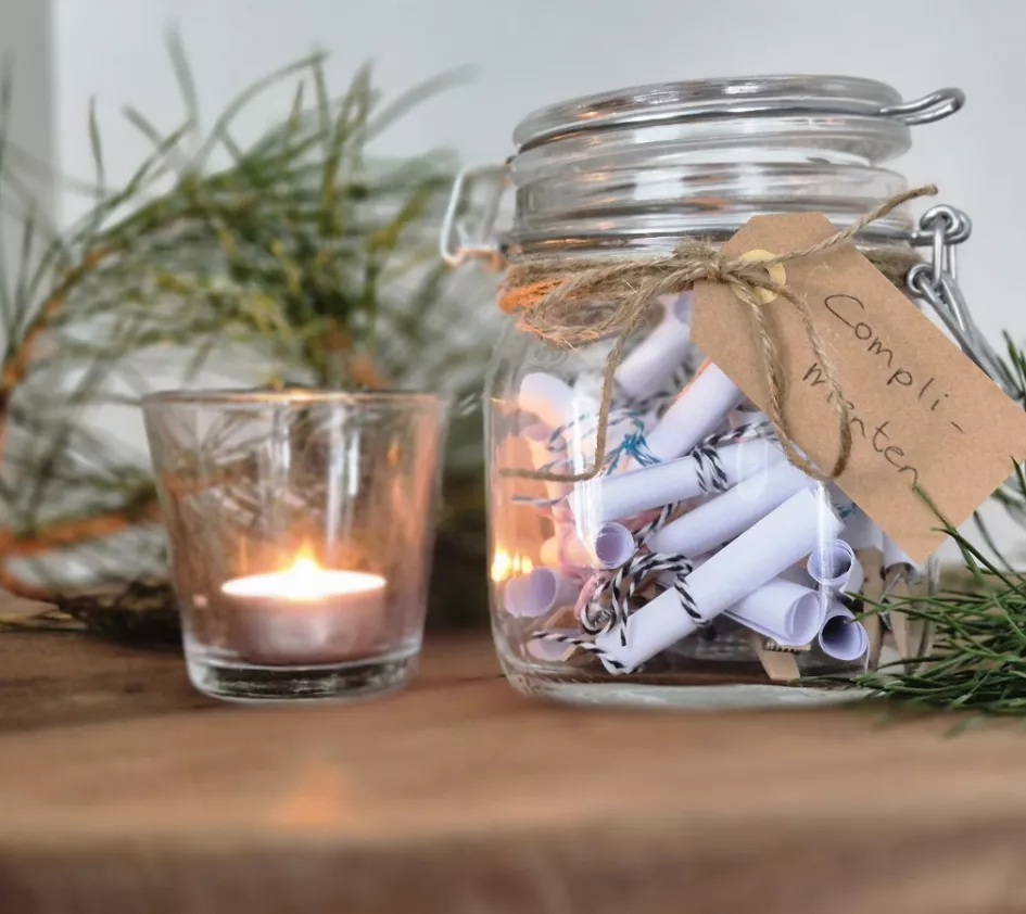 De komende dagen mag je iedere ochtend twee complimenten uit de pot halen. Geef er eentje aan iemand in jouw huis, en deel de andere met de eerste persoon die je buiten tegenkomt.