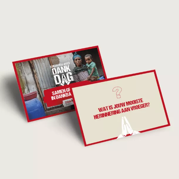 Vindt u het mooi om uw gemeenteleden uit te dagen om met elkaar in gesprek te gaan rondom het thema dankbaarheid? Vraag dan gerust een stapeltje gesprekskaartjes aan. U kunt ze bijvoorbeeld uitdelen tijdens het samen koffiedrinken in uw gemeente of na een dienst.