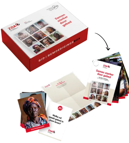 De Bid & Bemoedigingsbox is een gratis aan te vragen box met diverse materialen, waaronder een gebedswaaier met gebeden uit vijf crisisgebieden, gesprekskaarten en een inspirerende gebedsvideo. Zo kun je samen bidden en mensen in nood bemoedigen.