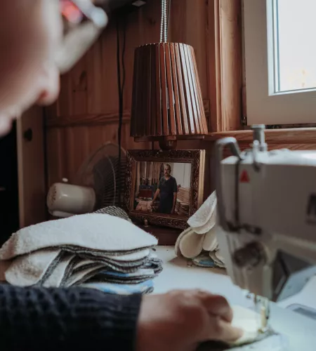 Het geluid van de naaimachine vult de kleine houten trailer, als Tetiana even stil is. Het kost haar zichtbaar moeite om de herinnering aan die afschuwelijke dagen terug te halen. Die afschuwelijke dagen, waarin Rusland de oorlog met haar land begon. Waarin haar dorp in de regio rond Chernihiv doelwit was.
