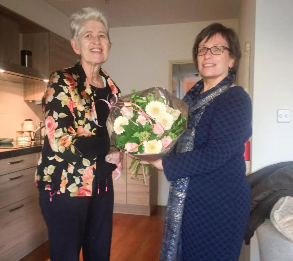 Marijke de Jongste, regiocoördinator van ZOA (rechts op de foto), bedankte Evie onlangs met een mooie bos bloemen voor haar jarenlange betrokkenheid. ‘Ik vind het bijzonder dat zij zich al zo lang inzet voor ZOA. Het treft me dat ze er hart voor heeft en er echt voor gaat.’ aldus Marijke.
