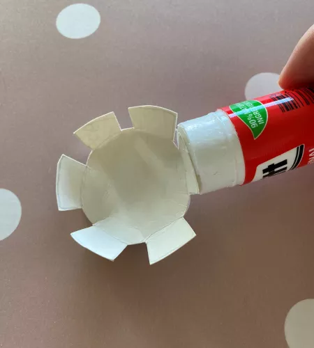 Smeer wat lijm op de 'uitsteekstukjes' en plak deze vast aan de binnenkant van de WC-rol. Het is mooi als het waxinelichtje precies even hoog komt als de bovenkant van de wc-rol. Houd hier dus rekening mee.