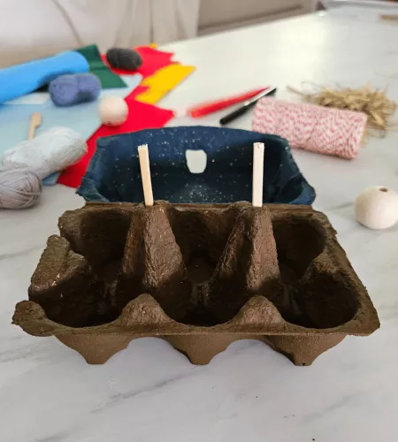 Verf de bovenkant van de eiderdoos donkerblauw en de onderkant bruin. Bestrooi de binnenkant van de deksel met glitter als de verf nog nat is. Dan lijkt het of er sterretjes glimmen in de nacht. Breek vervolgens de sateprikkers in stukken en prik ze door de twee punten van de eierdoos.