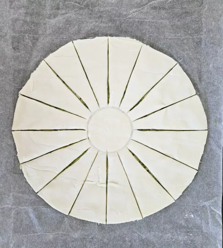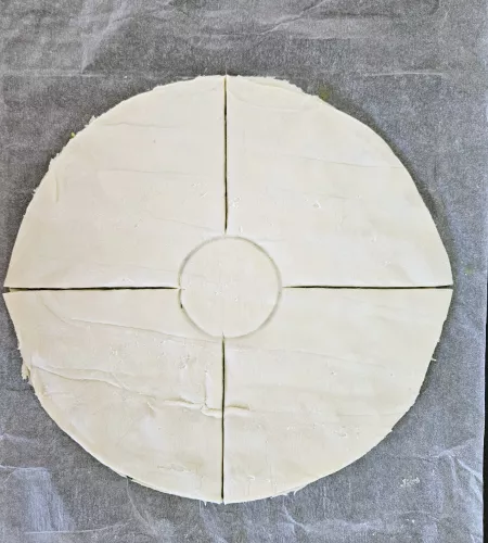 Snijd de cirkel op vier plaatsen in tot vlak voor het rondje. Je mag nu wél door het deeg heen snijden. Er zijn nu 4 kwarten.