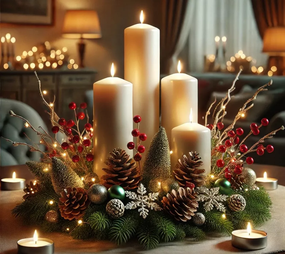 Dit is een kerststuk dat perfect is voor advent. Met vier kaarsen kun je aftellen naar kerst door elke week een kaars aan te steken. We gebruiken hiervoor verschillende soorten groen, zoals eucalyptus, dennentakken of conifeertakken, en voegen mooie versieringen toe, zoals dennenappels, besjes of glittertakken.