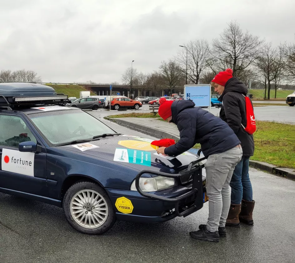 Met een volgeplakte auto trekken ze veel bekijks onderweg naar Noorwegen. Luuk: “De komende tijd blijven we doorwerven. Het kost ons wat, maar we hebben het er ook voor over.”